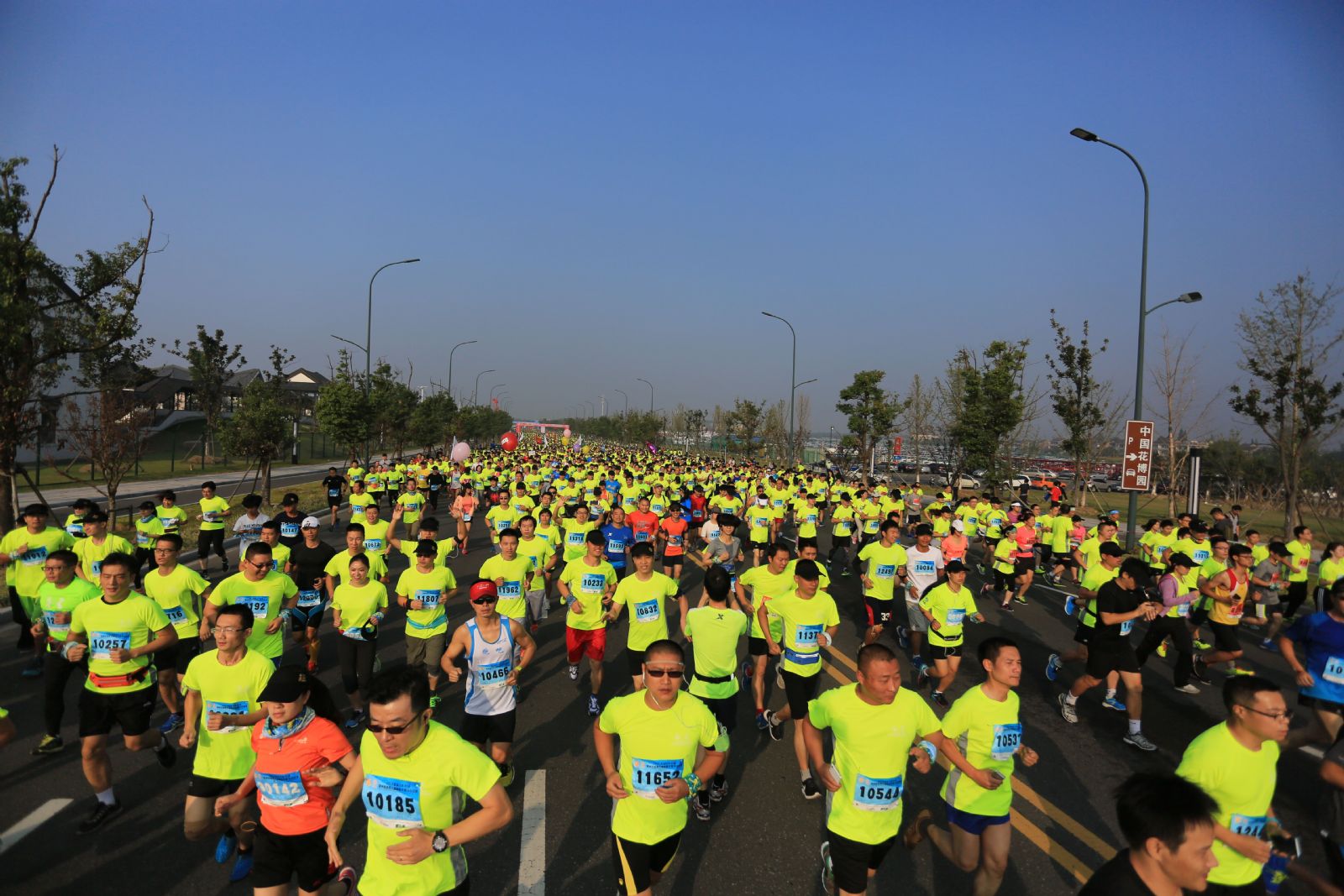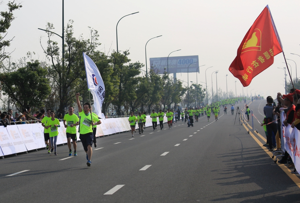 10月18日,2015常州武进西太湖国际半程马拉松在武进西太湖畔鸣枪开赛。来自中国、美国、加拿大、肯尼亚等国家的1万3千多名中外选手在中国国家女子排球队队长惠若琪与队员张常宁、陈展领跑下,一起跑出起点。
