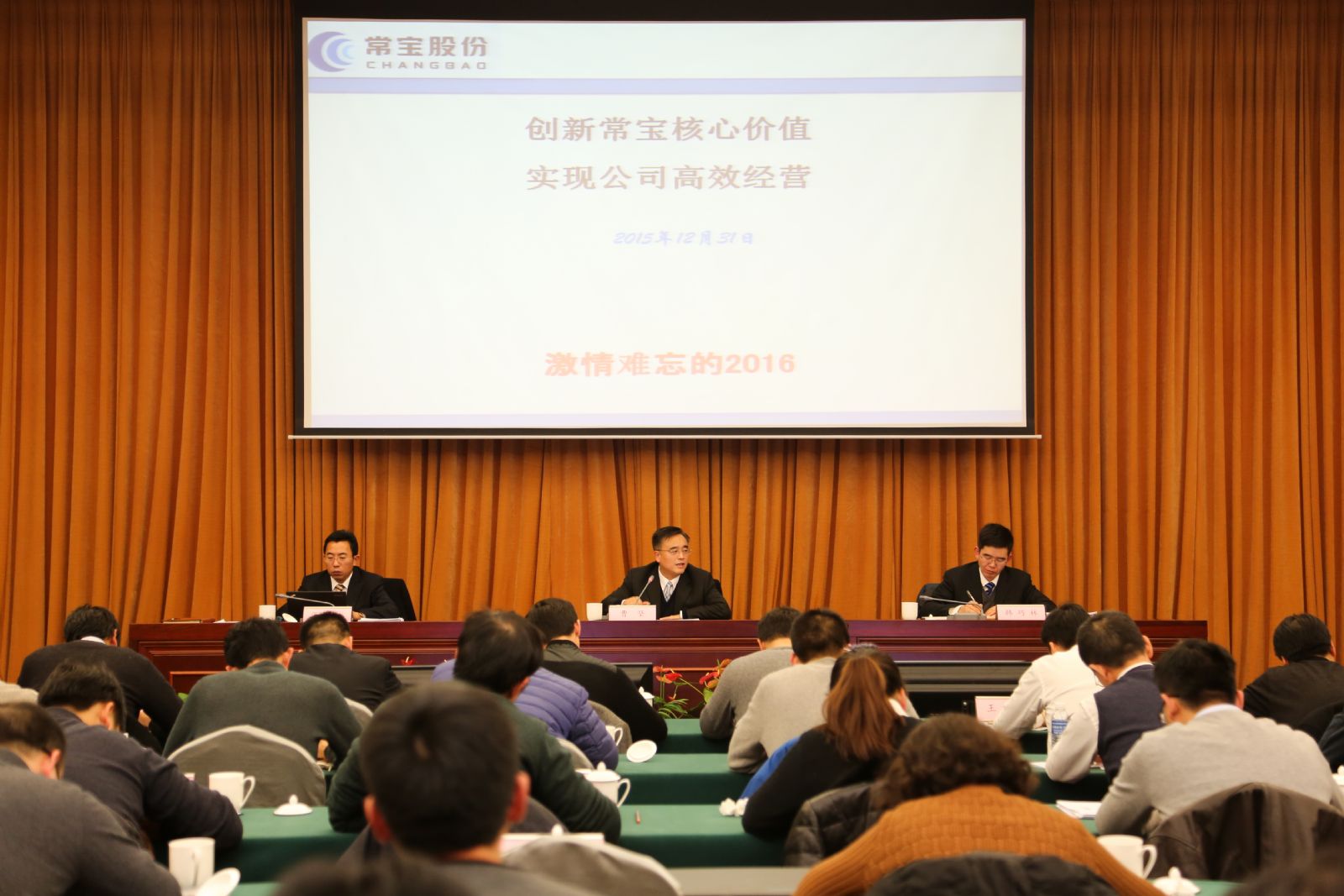 董事长曹坚首先代表公司董事会对以朱洪章总裁为班长的领导班子在过去一年取得的经营成绩,以及常宝全体干部员工在过去一年付出的辛勤工作表示衷心的感谢。同时,针对2016年市场形势、2016年公司经营思路以及常宝的几个基本问题作了重要讲话。