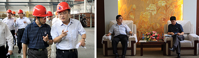 5月26日,新兴铸管集团有限公司刘明忠董事长一行在金坛市经济开发区相关领导的陪同下,来公司视察。公司董事长(总经理)曹坚,副董事长、党委书记陈普安以及执行总经理周家华进行了热情的接待。在曹总等公司领导的陪同下,刘明忠董事长一行视察了热轧分厂、管加工分厂、特殊扣线以及公司样品陈列室。