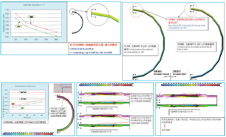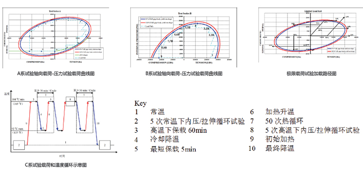 气密封性能栏之A项为按API RP 5C5之3.3.4(最终内压循环与热循环试验,热循环温度177℃) 的试验结果,B项为按TGRC1(弯曲、拉伸条件下气密封试验,弯曲狗腿度20°/30m,复合应力达到 管体屈服应力85%)的试验结果。