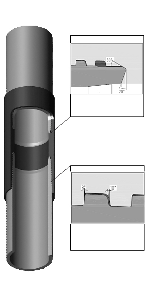 5)采用非API标准偏梯形螺纹,导向面45度,承载面2度。