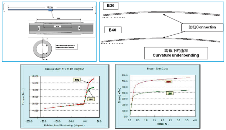 3、复合承载能力 采用逆向扭矩台肩和直角扭矩台肩相结合,使接头抗压缩、抗弯曲、抗过扭矩能力强,同时在